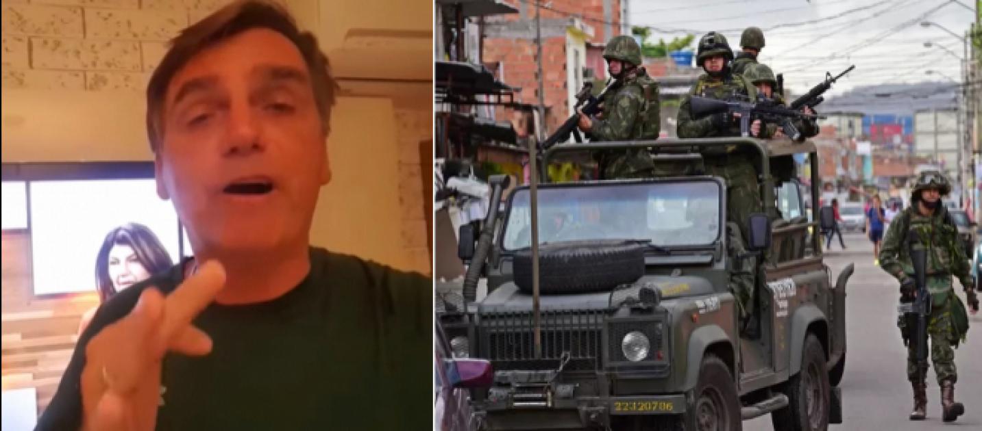 Bolsonaro criticou a forma com que a intervenção foi decidida – “nos porões do Palácio do Planalto, longe dos integrantes das Forças Armadas” –, e destacou acreditar que tudo não passe mais uma vez de “um remendo”, questionando as chances de sucesso. Todavia, ele defendeu ações energéticas e, se necessário, mais violência na capital fluminense.