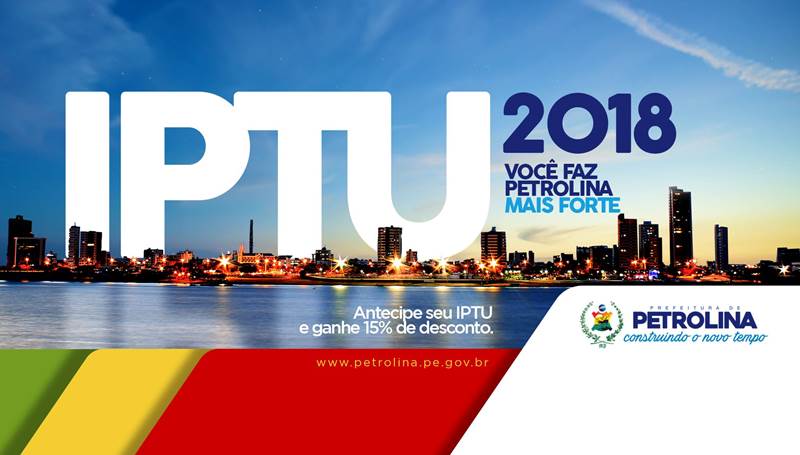 Continua sedo oferecido desconto para o pagamento do Imposto Predial e Territorial Urbano (IPTU) de 2018, em Petrolina. Até o dia 10 de abril, o pagamento em cota única tem desconto de 10%. O IPTU ainda poderá ser parcelado em até oito vezes, vencendo a 1ª em 10.04 e as demais parcelas em vencimento 30 dias após esta data, com o valor mínimo de R$ 49,02. Os descontos só são válidos para os contribuintes adimplentes até dezembro de 2017.