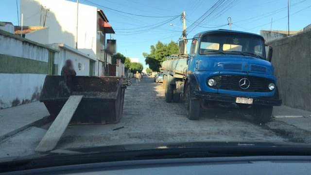 Na Rua Imperial, localizada na Vila Eduardo, o caminhão-pipa de um lado e um coletor de materiais de construção do outro simplesmente bloqueiam uma via pública, pela qual deveria ser de acesso a todos os cidadãos. E fica por isso mesmo. Fonte Blog do Carlos Britto