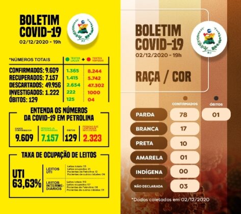 O boletim também registra um novo óbito pelo novo coronavírus, totalizando 129. Trata-se de uma pessoa do sexo masculino, de 84 anos, com histórico de outras doenças. O paciente estava internado em um hospital da rede pública de Juazeiro-BA e faleceu nesta terça-feira, 1º de dezembro.
