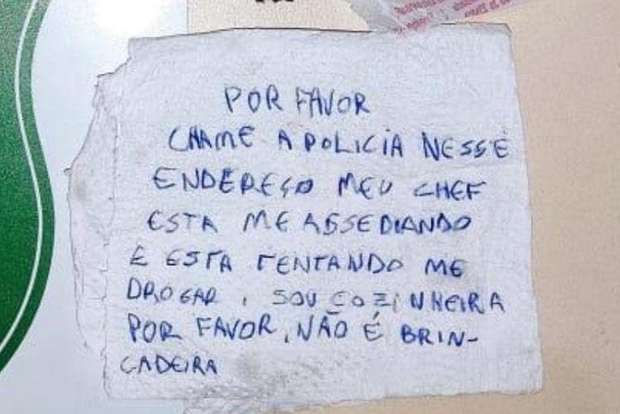 “Por favor, chame a polícia nesse endereço. Meu chefe está me assediando e está tentando me drogar. Sou cozinheira. Por favor, não é brincadeira”, dizia jovem no bilhete.