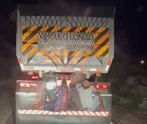 Três homens foram flagrados ‘pongando’ perigosamente na traseira de uma carreta na rodovia entre Sento Sé e Juazeiro, no Norte da Bahia. Eles estavam se deslocando de uma cidade para outra, em plena noite, aumento mais ainda o risco de uma tragédia.