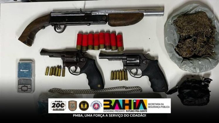 Com os criminosos foram encontrados dois revólveres calibre 38, uma escopeta artesanal, além de munições, maconha, cocaína, uma corrente dourada e uma bolsa cinza. Os objetos foram apresentados à Delegacia de Polícia Civil (PC) local para adoção das medidas legais cabíveis.