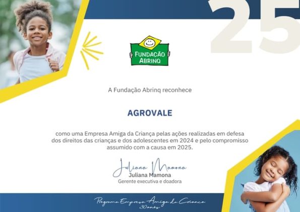 A Agrovale teve mais uma vez reconhecido seu compromisso com a infância e a adolescência. A empresa recebeu da Fundação Abrinq a renovação do Selo Empresa Amiga da Criança, com destaque para as ações desenvolvidas em 2024 e o compromisso firmado para o próximo ano. Esta é a 25ª vez consecutiva que a Agrovale conquista a certificação.
