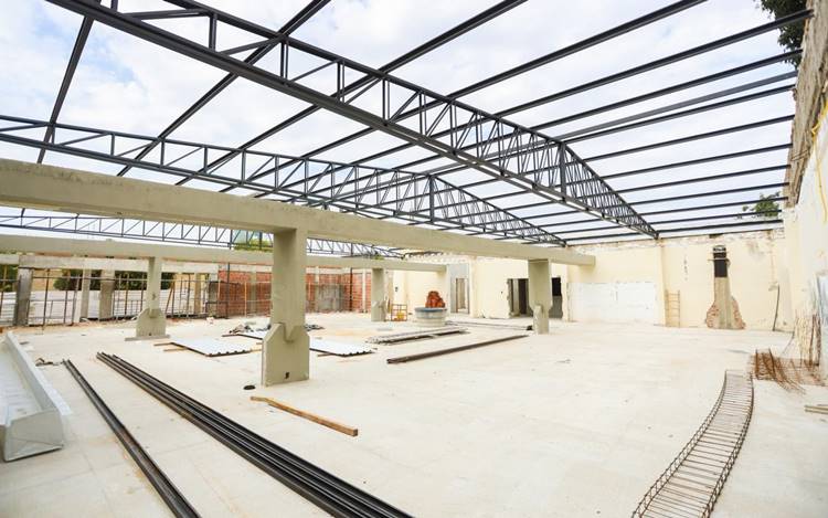 Com cerca de 35% dos trabalhos concluídos, a obra já conta com fundações prontas, paredes internas erguidas e a nova estrutura metálica do telhado instalado. A equipe trabalha atualmente na fase de cobertura e finalização das estruturas de concreto, além do início da construção da nova fachada.