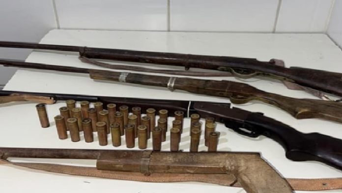 Durante as buscas, foram encontradas quatro armas, sendo uma espingarda calibre 28 e três de fabricação artesanal, além de 32 cartuchos de munição.